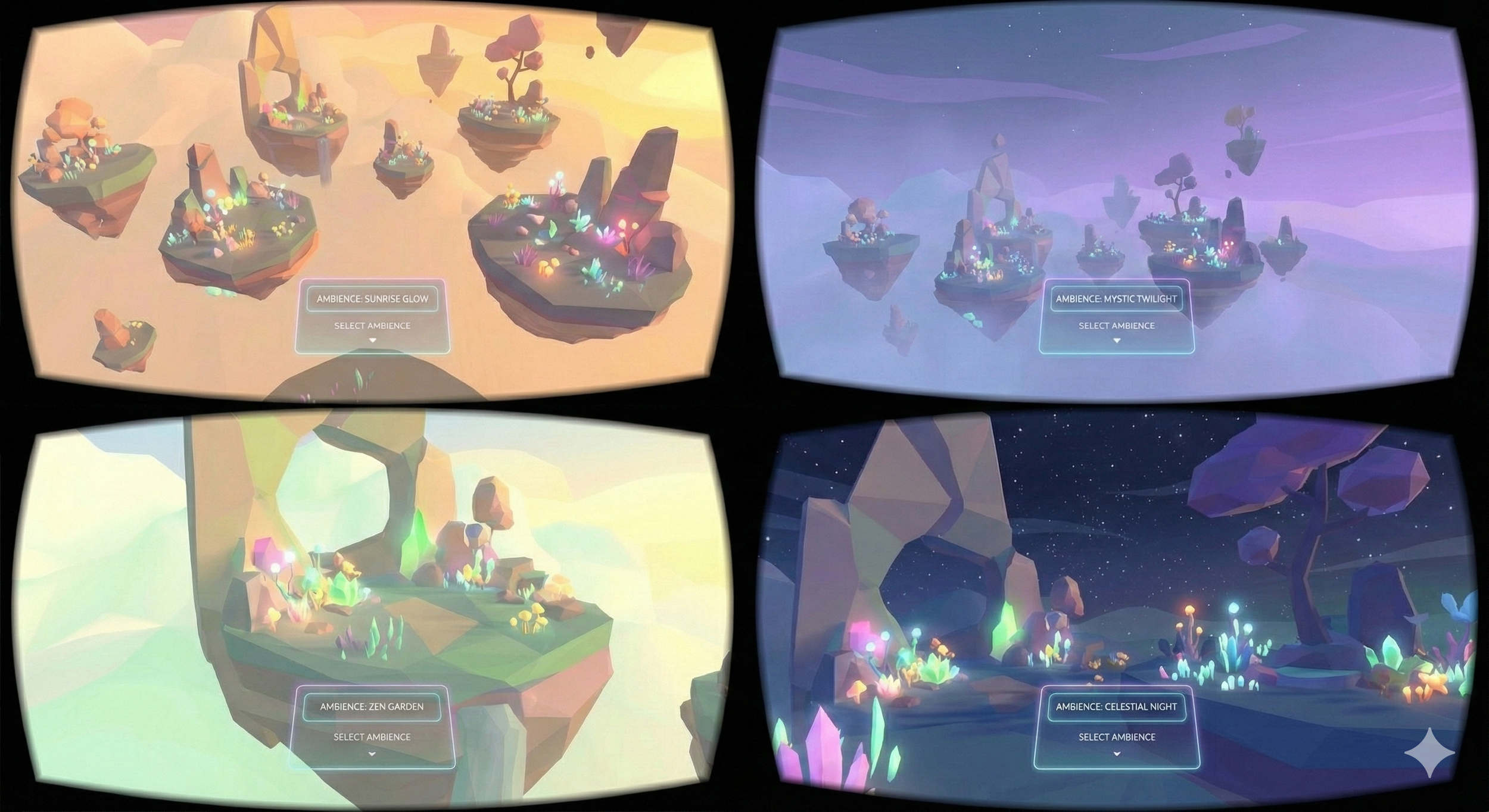 Each of the four meditation environments was built in Unity using low-poly terrain sculpting, custom skyboxes, and baked lighting to give each scene a distinct mood — warm amber for Sunrise Glow, deep purples for Mystic Twilight, soft whites for Zen Garden, and a crystal-lit sky for Celestial Night. Particle systems added subtle environmental life through drifting light orbs and glowing foliage, while the ambience selection UI was kept minimal to avoid breaking immersion. Every scene was optimized for Meta Quest's standalone hardware, balancing visual richness with the smooth frame rates essential for a comfortable VR experience.